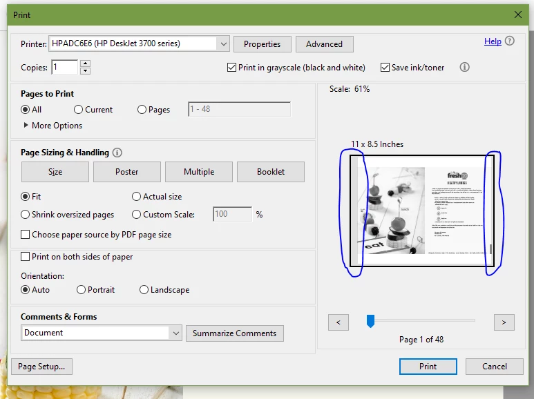 The print preview window shows no margin at the top, but about an inch at the bottom. How can I change this so it's centered when I print? The option to change the margins is not available.