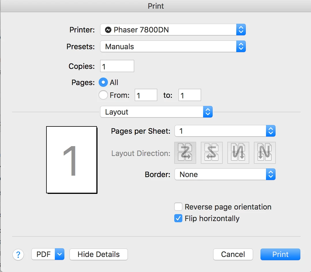 I need to print my plans as mirror reverse. Not 180 degrees out.