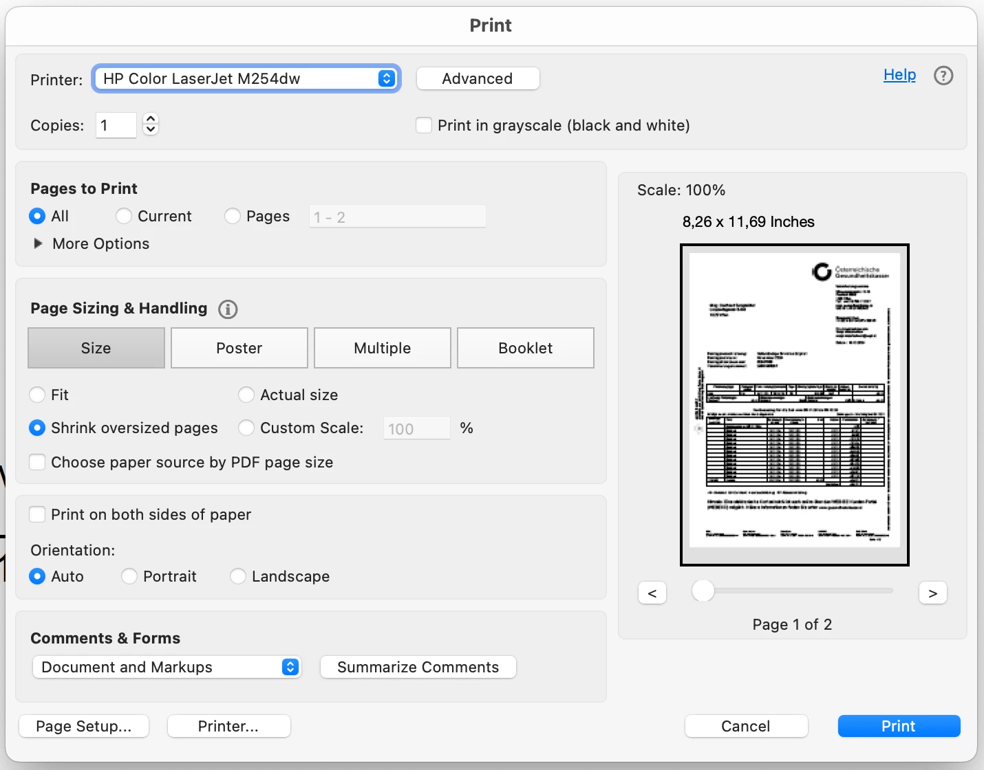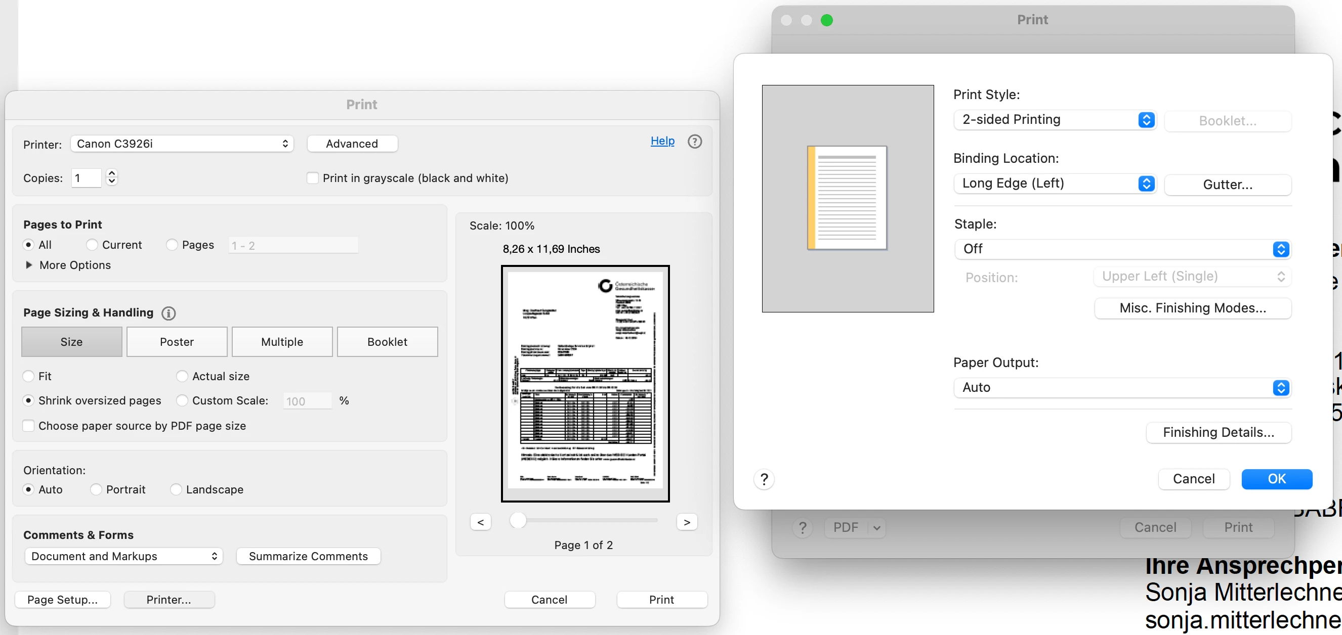Hi, I'm using Acrobat 24.005.20320 in macOS 15.1.1. My network printer is a Canon iR-ADV C3926, with the Canon-supplied v10.19.20 driver.