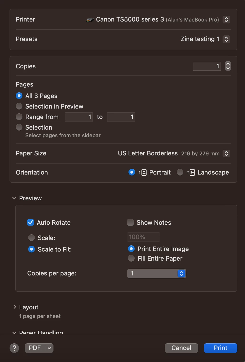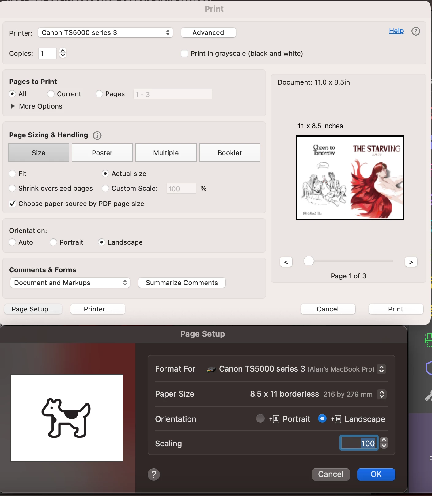 My printer is a Canon ts5000 printer, and I use a Mac OS 13.2.1. I chose to print a booklet through Adobe Acrobat because of the vibrant colours that come through when printing. However, even when I set the paper to "Letter Borderless," a white margin still appears.