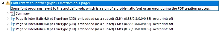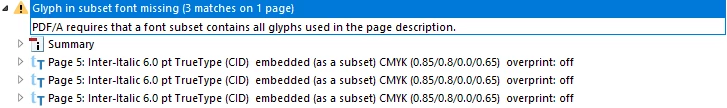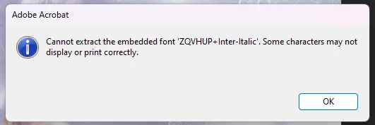 It seems to be a well-known problem that occurs from time to time. The problem occurs with our company account with two licenses. We are using the latest version of Adobe Acrobat 25.1 (CC). The files were exported from InDesign as usual. From one day to the next, the error message appeared: "Cannot extract the embadded font ‘ZQVHUP+Inter-Italic’. Some characters may not display or print correctly." Unfortunately, the specified font is also only displayed in the form of dots, so that it is no longer possible to correct the documents.