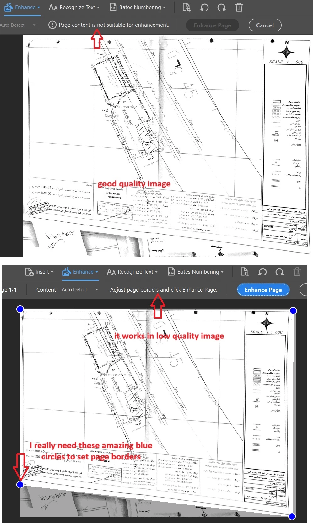 When Scans are in their original color or with Low resolution, the Enhance tool works. But, for images already cleaned with B&W or Whiteboard filter or Scans with higher resolution, the Enhance tool of Adobe Acrobat gets disabled with the message "Page Content is not suitable for Enhancement".
