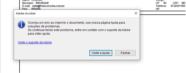 Estou tendo problemas em 3 computadores ao imprimir um arquivo.pdf, ao imprimir exibe uma mensagem dizendo que ocorreu um erro ao imprimir o documento, use nossa pagina ajuda para soluções de problemas. se continuar tendo este problema, entre em contato com o suporte da adobe para obter ajuda.