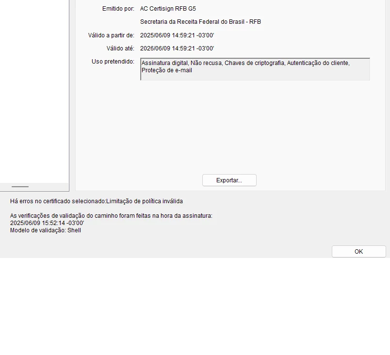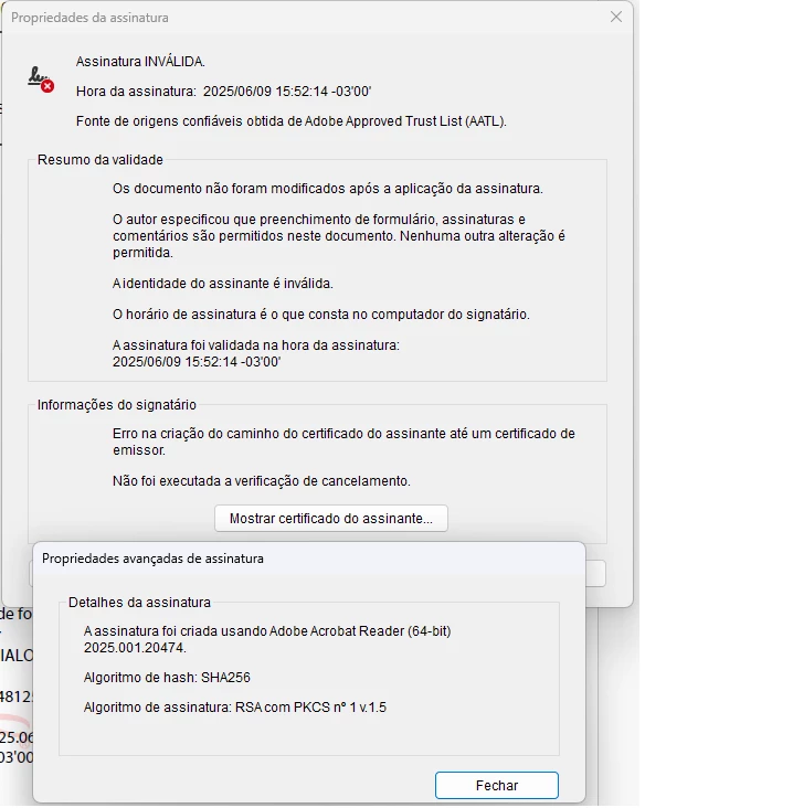 estou tentando utilizar certificaçao digital tipo A1 (Certisign) mas encontro erro na validação da assinatura. Funciona em outras plataformas mas pelo Adobe não.