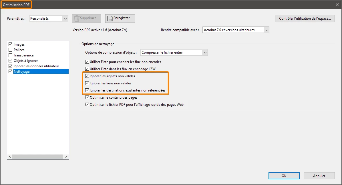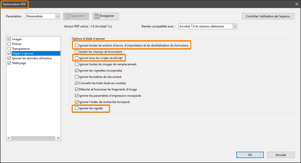 Acrobat DC souffre d'un bug lors de l'optimisation de fichier. Lorsqu'on optimise un fichier, les liens des boutons sautent. Par exemple, pour un un bouton renvoi de page, le bouton est toujours présent, mais ne revoie pluss à la page. Merci de rapidement régler ce désagréable problème. Bien à vous