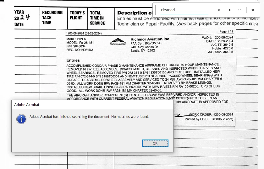 My Acrobat is no longer able to locate OCR text in a pdf. The weird thing is that when I search using ctrl+f it will show that there are results, but if I try to see the location of those results it tells me that no matches were found. But I can select the text, and in this example you can see that it's already been selected.