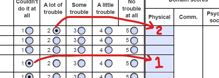 I would like to be able to program the fields under 'Physical' column to show which radio button was selected for that line (and then total these at the bottom of the page, which I can do.)