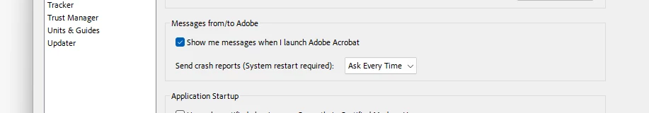 I receive the same message when starting Acrobat, one in particluar about "converting any file to a pdf" and its absolutely annoying. I unchecked the box in Preferences>General. However, it won't stay that way and goes back to the default as checked. Anyone know how to permanently uncheck this thing?