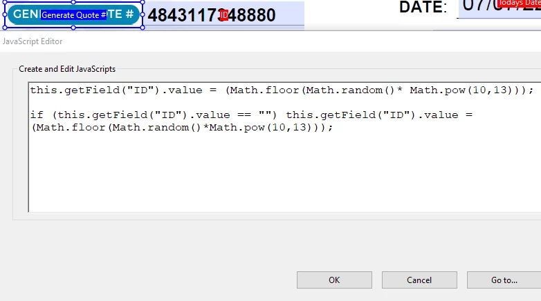 I am createting a pdf form that has a unique field and button. The field is called "ID" the button is called "Generate Quote #"