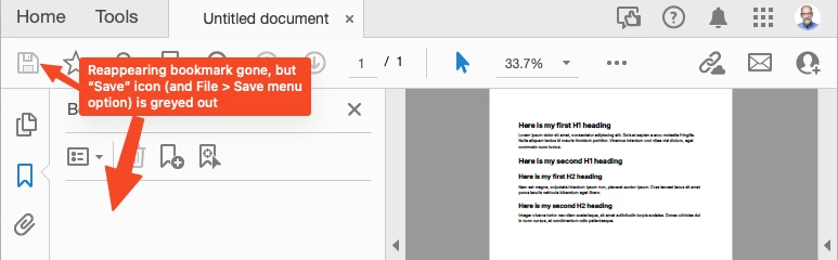 I then reopen the "bookmarkless" document and, lo and behold, the first bookmark is back.