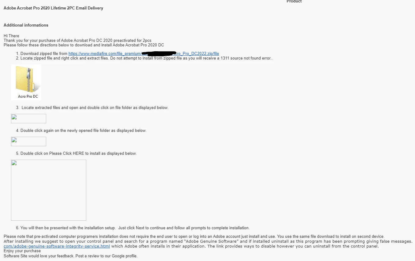 Based on the listing, I would have expected to receive a license key valid to activate a copy of Adobe Acrobat Pro 2020. However, instead I received a Mediafire download link for the software (with references to Adobe Acrobat DC (I don't think "Acrobat Pro DC 2020" is a thing) - which is supposed to be the continuous subscription track), alongside instructions to disable/remove Adobe Genuine Software (I suspect they mean Adobe Genuine Service) as it throws out "false positives" (how convenient?).