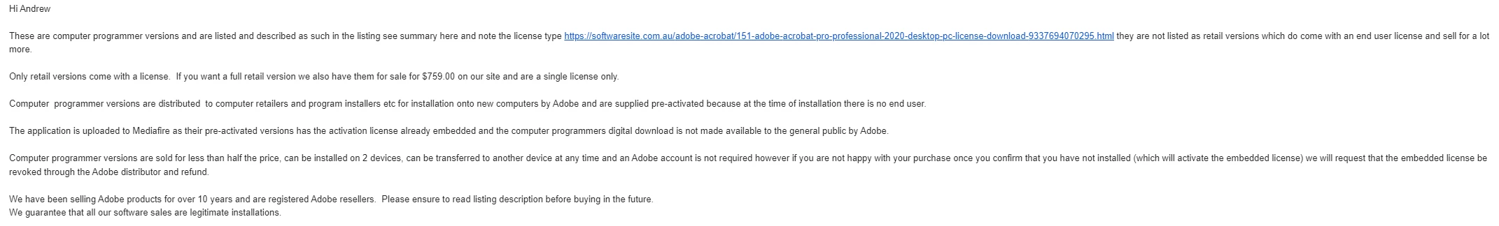 I recently purchased a copy of what I thought would be Adobe Acrobat Pro 2020 from an Australian dealer that seems to offer (other) legitimate software and has a valid business number. The listing is https://softwaresite.com.au/adobe-acrobat/151-adobe-acrobat-pro-professional-2020-desktop-pc-license-download-9337694070295.html