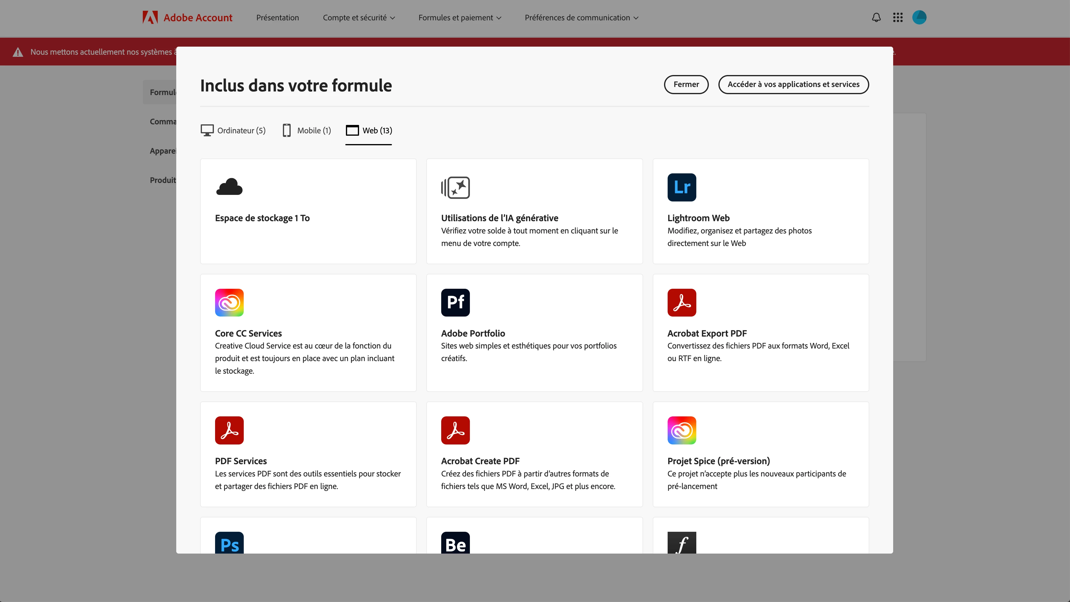 J'ai souscrit l'offre "Formule Creative Cloud pour la Photo avec 1 To" à 23,99 €/mois. Quand on regarde ce qui est inclus dans la formule, il est indiqué que celle-ci contient 5 applications pour ordinateur, 1 application pour mobile et 13 applications web. Dans ces dernières, on trouve Acrobat Export PDF, Acrobat Create PDF et PDF Services.