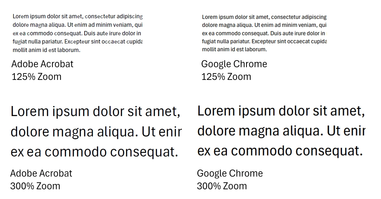 Our company recently adopted the Aptos Narrow font as the official font for all documentation. However, we've encountered an issue where the font renders incorrectly in PDF format using Adobe Acrobat at certain zoom levels. Interestingly, Google Chrome and Microsoft Edge renders the font correctly at any zoom level.