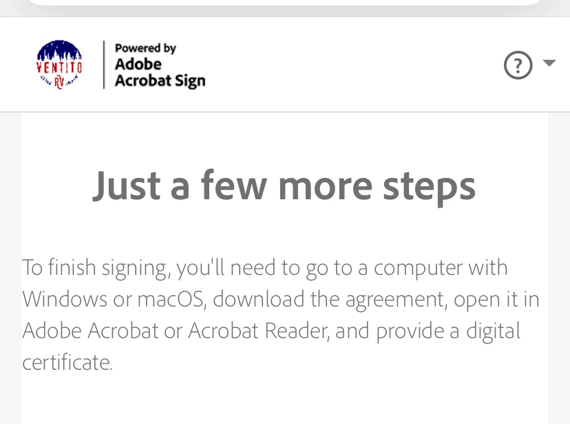 TASK2: Same situation but I opens the email with the Outlook app on my iPhone 11, version 18.7.1. The email has the normal "review and sign" blue button, I click on said button. It proceeds to open the default web browser and you have to click "continue." It then states "to finish signing, you'll need to go to a computer with windows or macOS, download the agreement, open it in Adobe Acrobat or Reader, and provide a digital signature." (see attached pic from my IOS device)