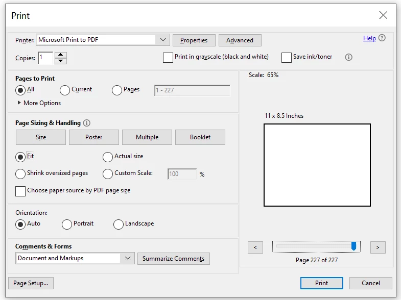 I regularly combine multiple pdfs (one printed from word and then combined with multiple, 10+, printed from excel). However, when you view the pdf all of the page sizing is very different. By going to file->print to pdf then selecting "Fit" under page sizing and handling, this resolves the page sizing issue as intended. However, even with the Orientation option set to "Auto", when I print to pdf then all pages are portrait orientation i.e. the orientation is not retained. It seems like the auto orientation setting is not working. The only solution I have found is to manually go through the pdf afterwards and carefully rotate the pages. However, this can be 100's of pages and is very time consuming and prone to human error. Please advise if there is a way to adjust the page sizing AND retain the existing orientation.