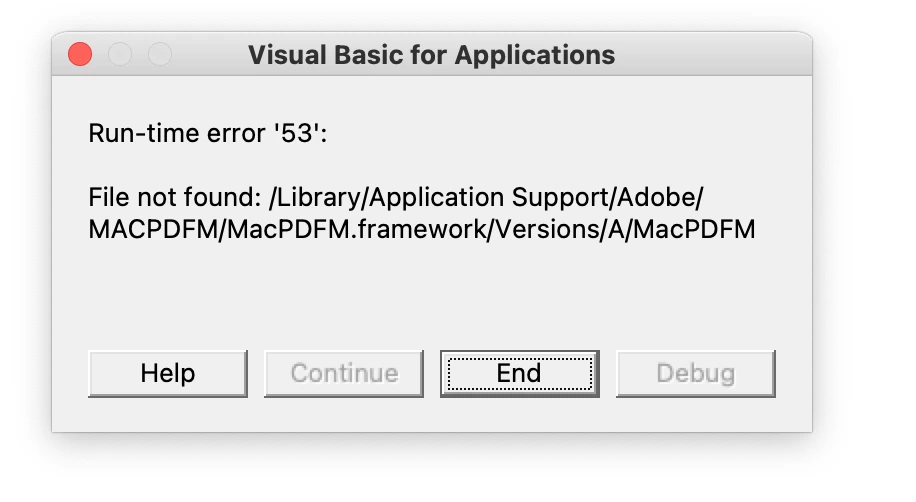This error typically occurs because Adobe PDFMaker for Mac (a component that integrates Acrobat with Microsoft Office) is either: