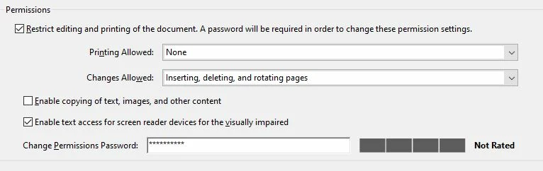 If I choose the last option under Changes Allowed to "Any except extracting pages" will satisfy most of my need but won't block the document to be edited