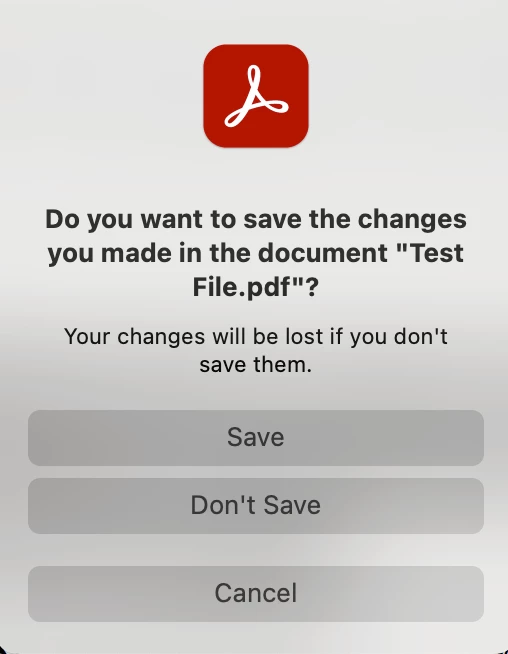 Since updating the Mac OS to Ventura the focus on the Save button in Acrobat has been lost when I edit a PDF. Previously, if I deleted a page from a PDF and then hit Apple W to close the file, the save dialogue box came up and the Save button was active, so all I had to do was hit return to save & close the file. Now when I hit Apple W to close the file, the save dialogue button comes up but none of the buttons is active (see screenshot), so I have to use the mouse to click the Save button. Not the end of the world, but when you're editing lots of PDFs, the loss of just hitting return to save and close is a bit annoying. Acrobat version 2023.001.20177, Mac Os 13.4
