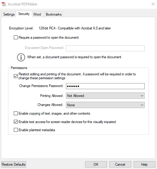 For ex- in Word, you can try disabling security by clicking Acrobat tab in the ribbon > Preferences > Security tab > uncheck the box under permission and check if that helps. Below is a screenshot: