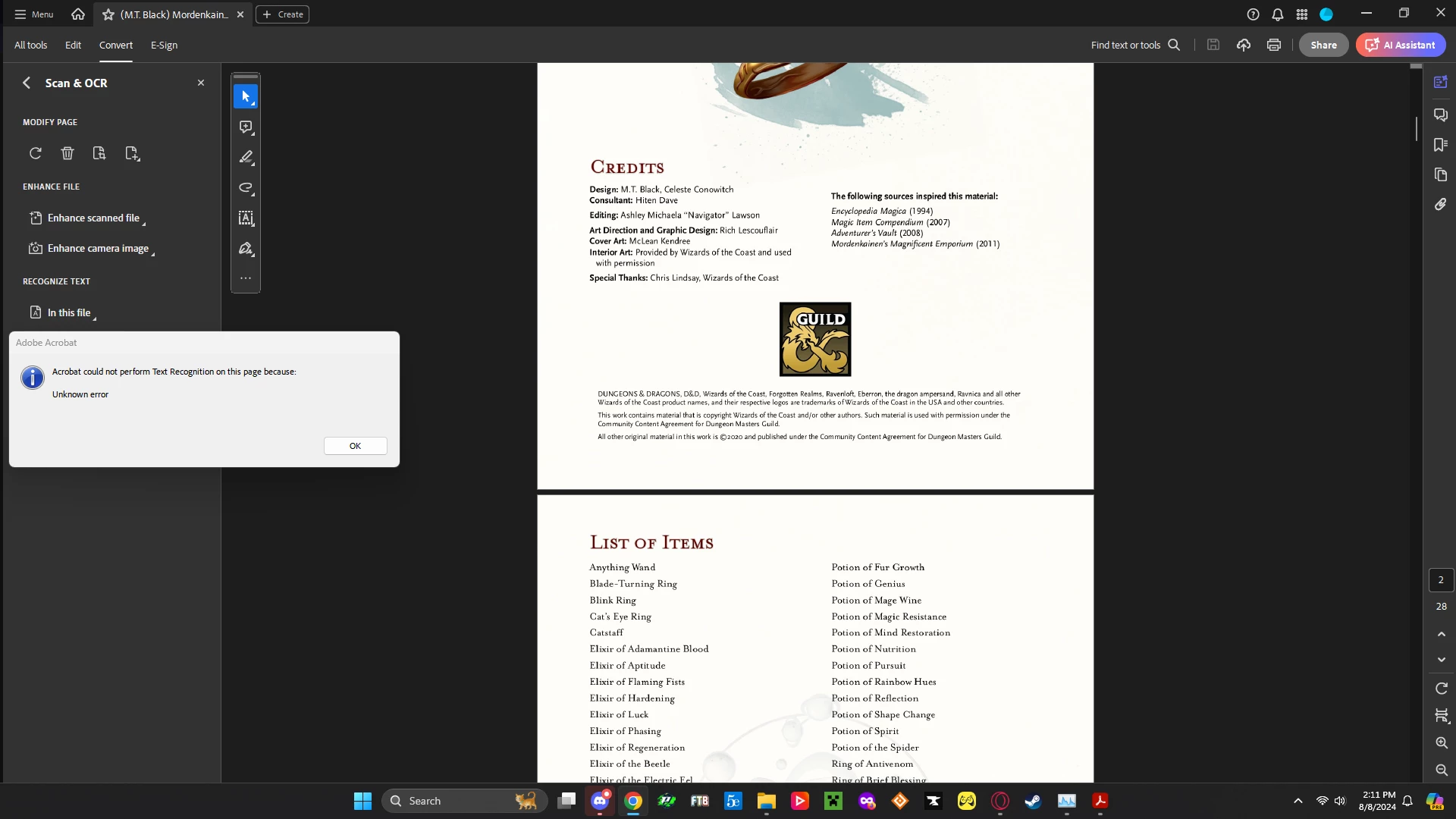 I am trying to get a few pdfs searchable, however twhen I use the scan&Ocr tool it give me "Acrobat could not perform Text Recognition on this page because: Unknown error." I have tried uninstalling and reinstalling to no avail now three times.