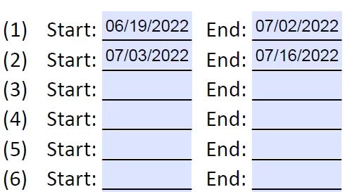 Hello. I am trying to build script for auto-populating dates on a pay period planning tool. The goal is for the user to enter the start of the pay period on the first start date column and then to have the rest of the dates autopopulate every two weeks through the remainder of the pay periods. Below is a snapshot of what it looks like and the first two periods manually filled out. In this case the first pay period started 6/19 through 7/2, the next starts 7/3-7/16, the next would be 7/17-7/30 and so own. Anyone able to help with the script on this?