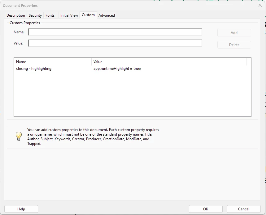 app.alert({cMsg:"Incomplete! Missing fields:\n" + emptyFields.join("\n"), nIcon:1,});