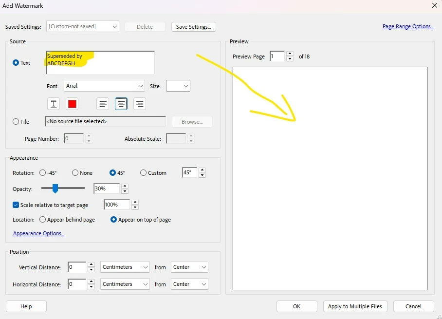 2. The watermark source (Text) does not display in the preview window so you cannot visualiise how this will look without selecting OK and then looking at the actual result - see attached screenshot.