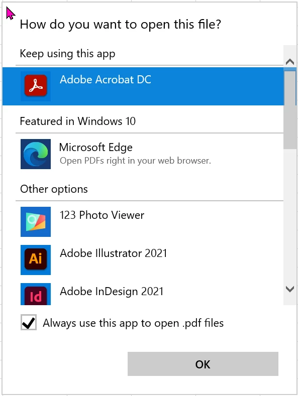 Set Acrobat Reader or Acrobat your default PDF program on Windows 10