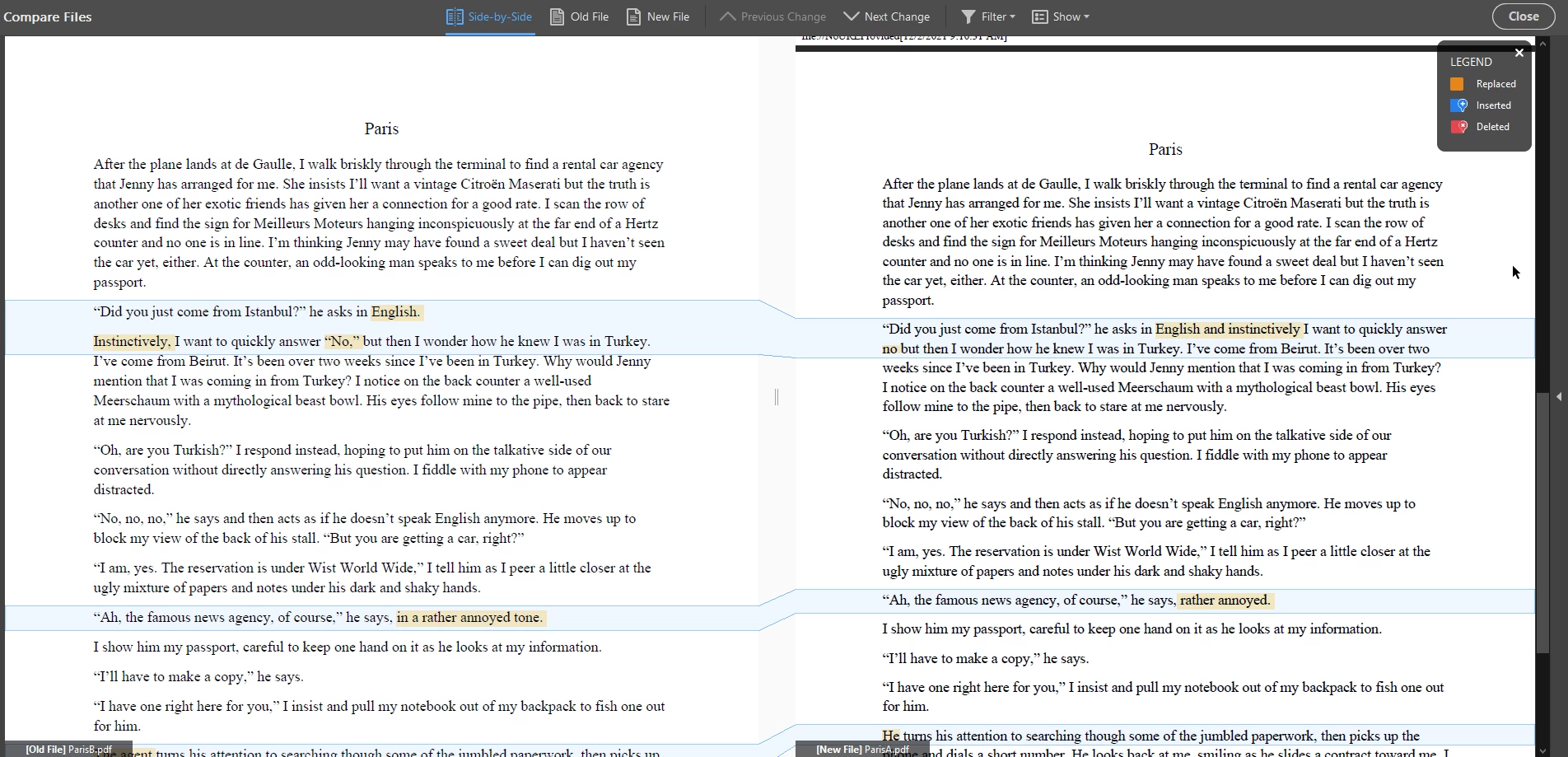 You're welcome, glad I could help. AFAIK, the results aren't displayed with red strike-throughs (as you would find in Word's compare documents results) but they are highlighted like this in red, yellow, and gold: