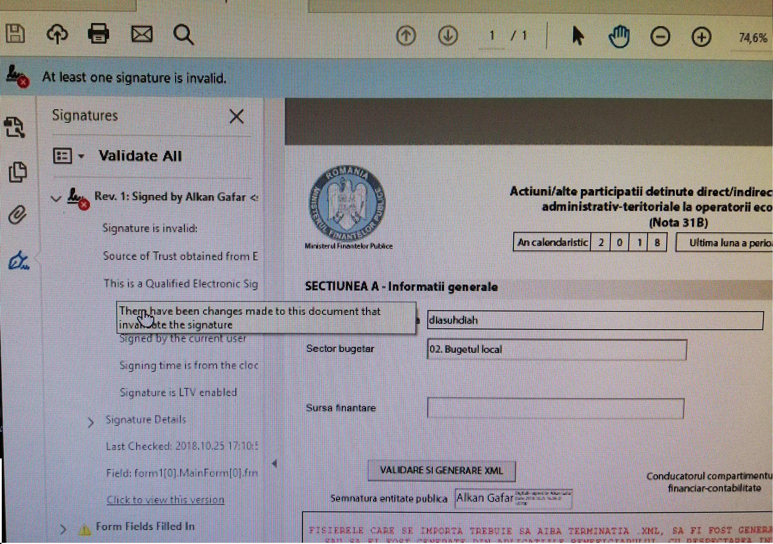 The error message is: " There have been changes made to this document that invalidate the signature"