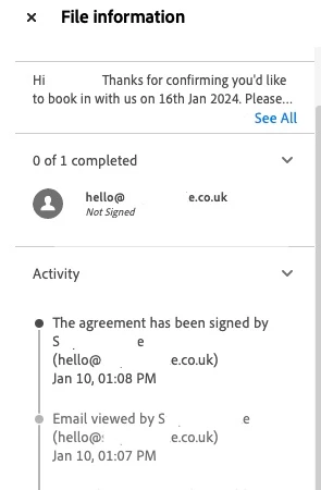 'Activity' lists document as Signed