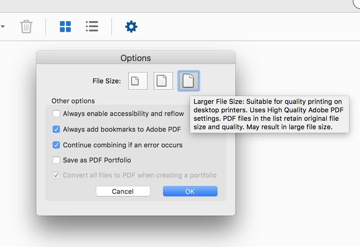 Unfortunately Adobe dumbed down their interface here so you do not really know the dynamics of what's taking place here but if you mouse-over the three options you can at least see "sort of" what's taking place here. In the Combine Files window, if you click on the gear icon you can see the three options. You can see which one you need to correct if you feel you need it. But keep in mind, if you do not SEE any visible difference between your original scanned documents and the combined document, there's no real need to do this.