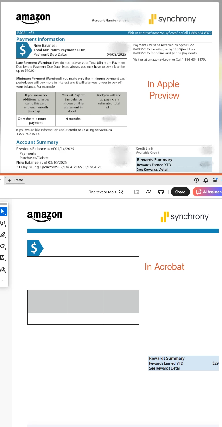 See examples posted (top is in Preview, bottom is in Acrobat)