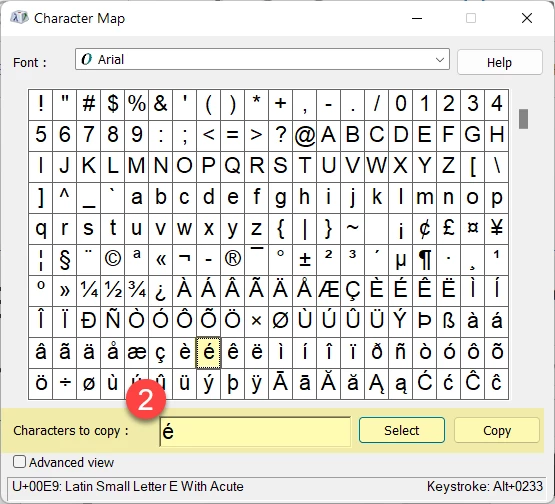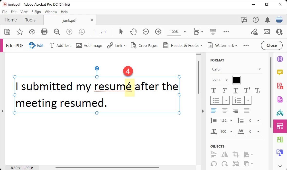 In Acrobat, it's a bit more work to swap in an accented character: