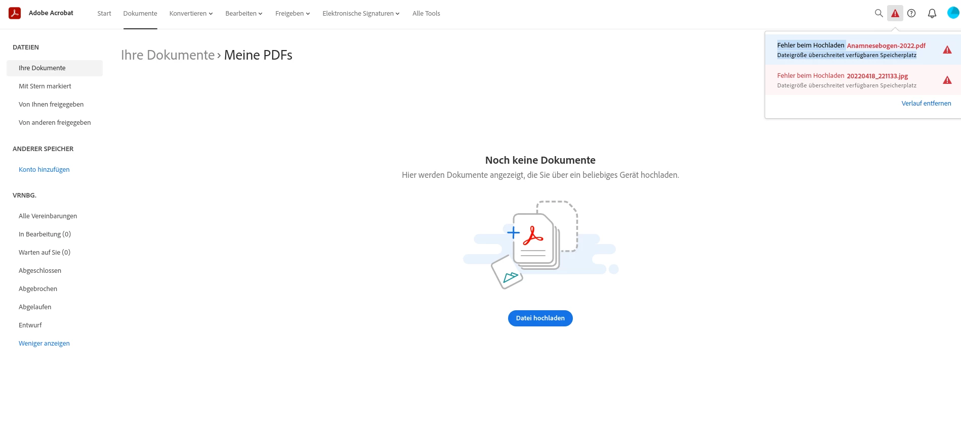 Die Datei ist eine einfach PDF und ein paar hundert Kilobyte groß. Ich habe Speicherplatz in der Creative Cloud frei wobei ich annehme, dass die nicht dazuzählt. Allerdings wäre das meine allererste Datei, die ich als PDF dort hochlade und man hat soweit ich herausfinden konnte so oder so 2GB frei. Ich habe einmal einen Screenshot gemacht. Ich habe nichts finden können, dass mir sagt was dort los ist. Ich kann auch keine Dateien löschen, da ich keine in der Dokumentencloud habe.