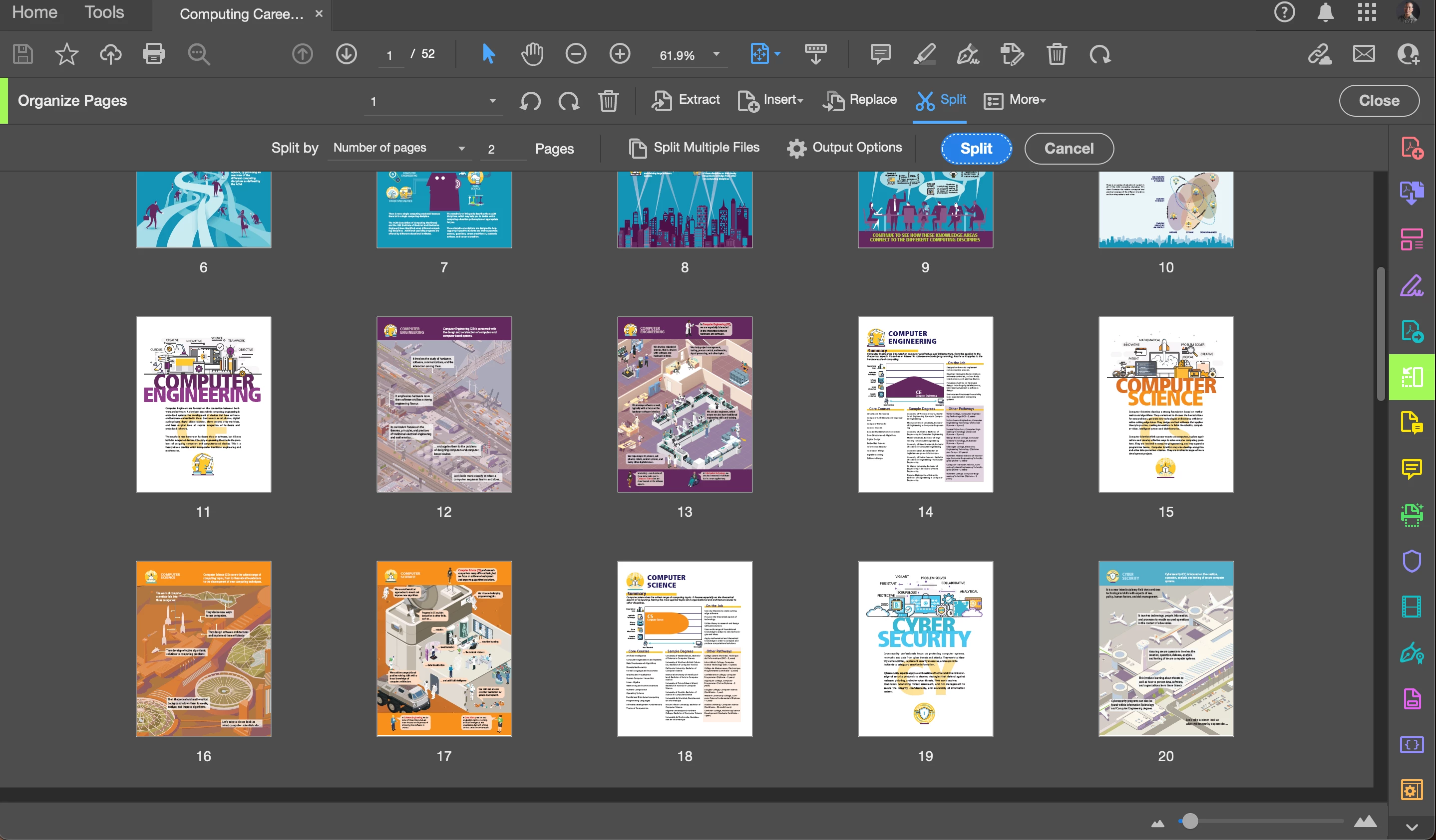 I have Acrobat Pro (the latest) through my employment. We had an outside company scan 600 files for us and many have pages that were scanned as one document instead of separated out. Those that should have been separated can vary in pages, therefore the split tool in my program is useless for such a large project as you can only select one specific number of pages to split out for the whole document. On the online Adobe Acrobat site, I can see that it looks like the Acrobat PDF Splitter is there, which I have used in the past and is perfect for the project, but when I try to use it, it asks me to upgrade to Acrobat Pro. I know there are other ways to do this, using the extract tool or other ways, but this is a very large project and those ways are too time consuming for what I have. Any suggestions?