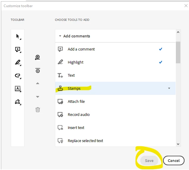 The Stamps option isn't available when trying to customize toolbar. I have Adobe Acrobat Pro and Standard but neither appear to have this option. Save is greyed out. Can someone assist on how to fix or explain why this can't be done.