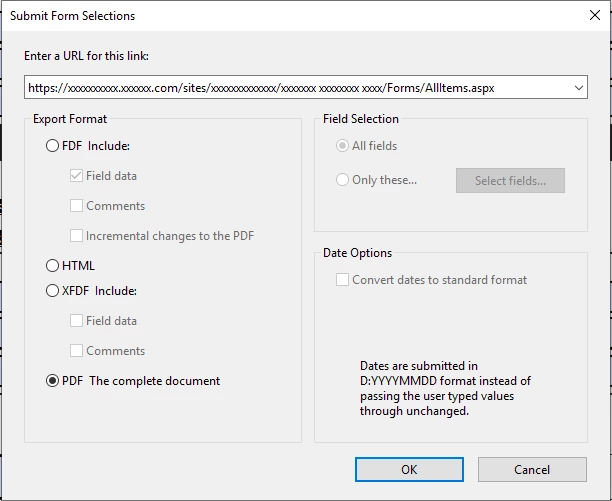 I have a fillable pdf form with a submit button. I followed all of the directions when creating the button. I have tried multiple times and everything that I could think of but the button is not working when I click on it. What I mean by not working is, when I click on the button it takes me directly to the location of where I want the pdf to be stored when you click the submit button. So you click the button on the pdf and it should save the file in another location. Instead of save the file it just opens that location. I hope that makes sense. I'm not sure what exact is going on. I am not trying to email the pdf to anyone via the submit button but that does work. I just cannot get the pdf to save to the location that I want it to once I click the submit button after filling out the form. I have tried to do this on my computer locally and via sharepoint. I would like it to work on my sharepoint site but either way, I need this to work. I hope this all makes sense. I could really use some help. Thank you.