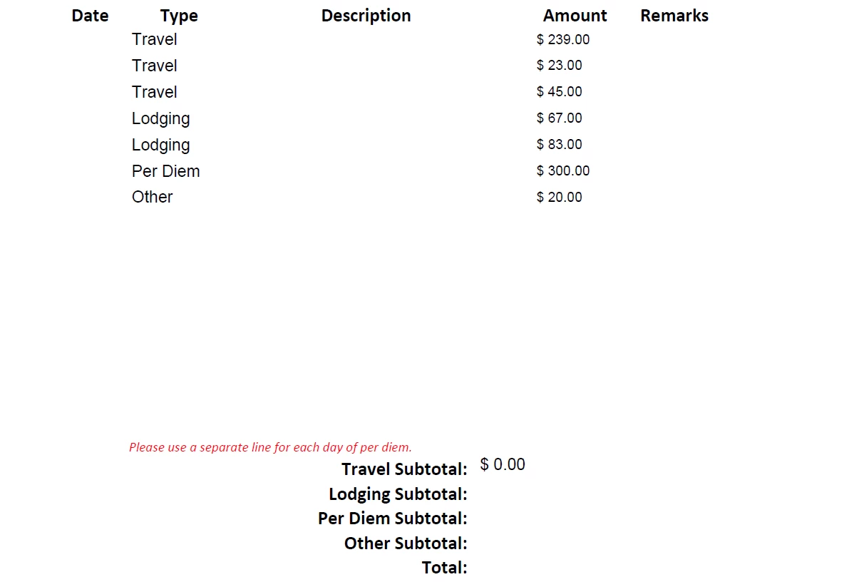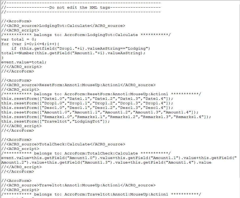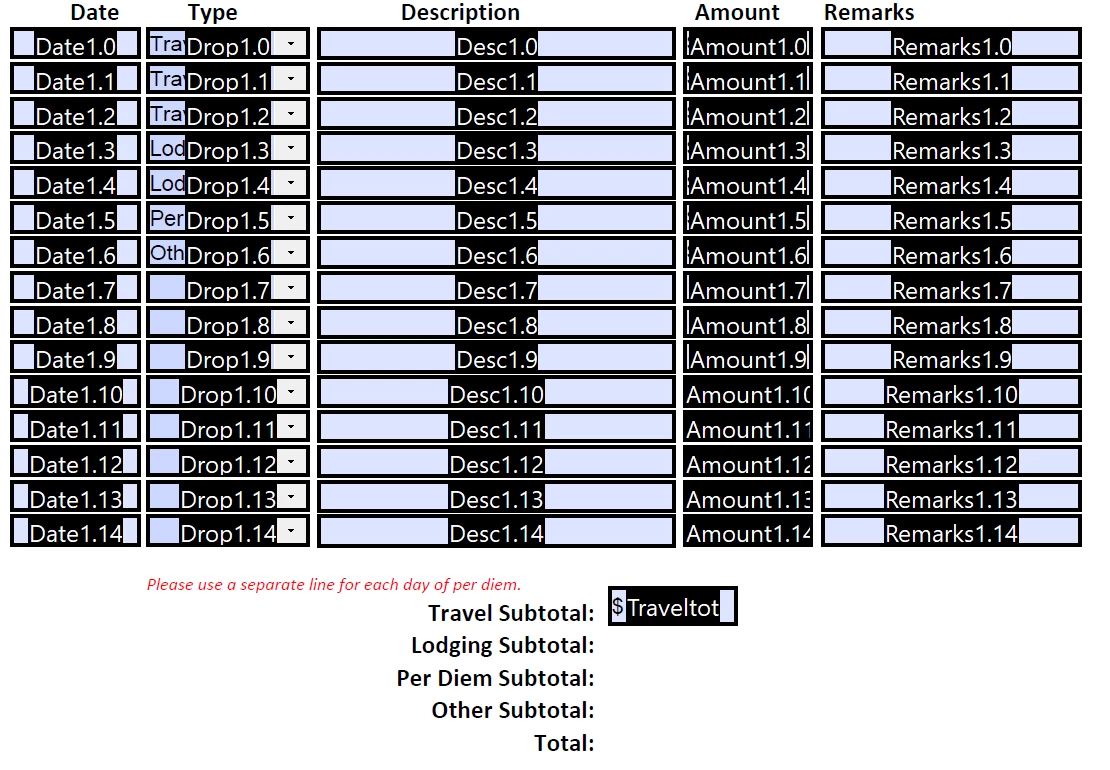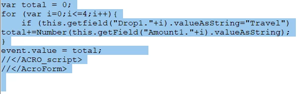 I'm trying to create an expense reimbursement form that auto calculates amount subtotals based on the selection of expense types. Essentially, I want to have all Travel go into one subtotal field, all lodging to go in another, all per diem in another, etc. Is there a way to perform a SUMIF function in a PDF that will distribute those expense amounts by expense type? Thanks