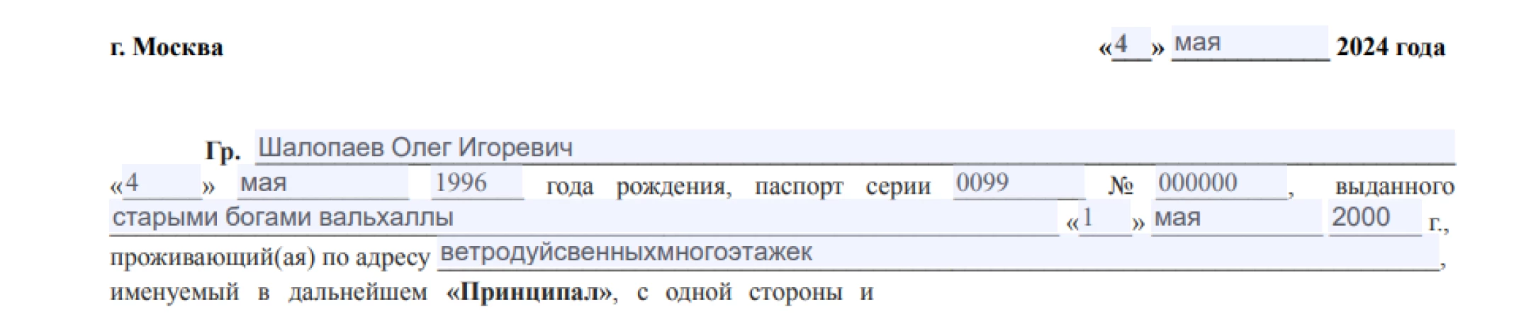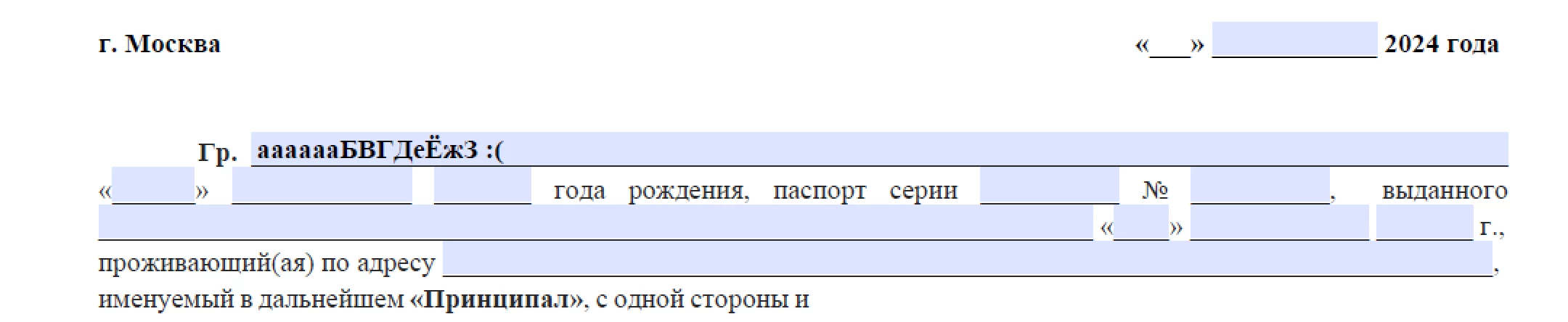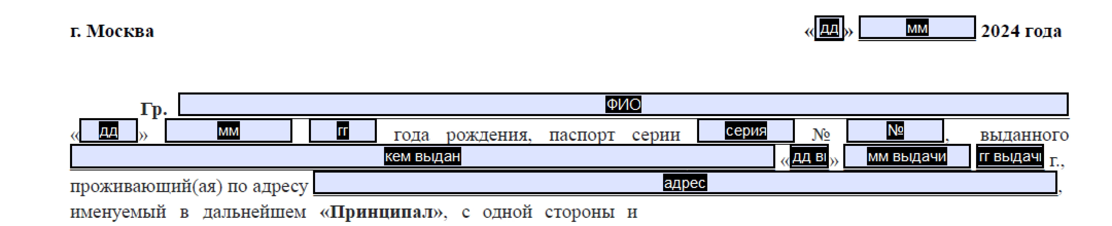 1. Вот у меня стандратный договор со стандартными полями для заполнения: