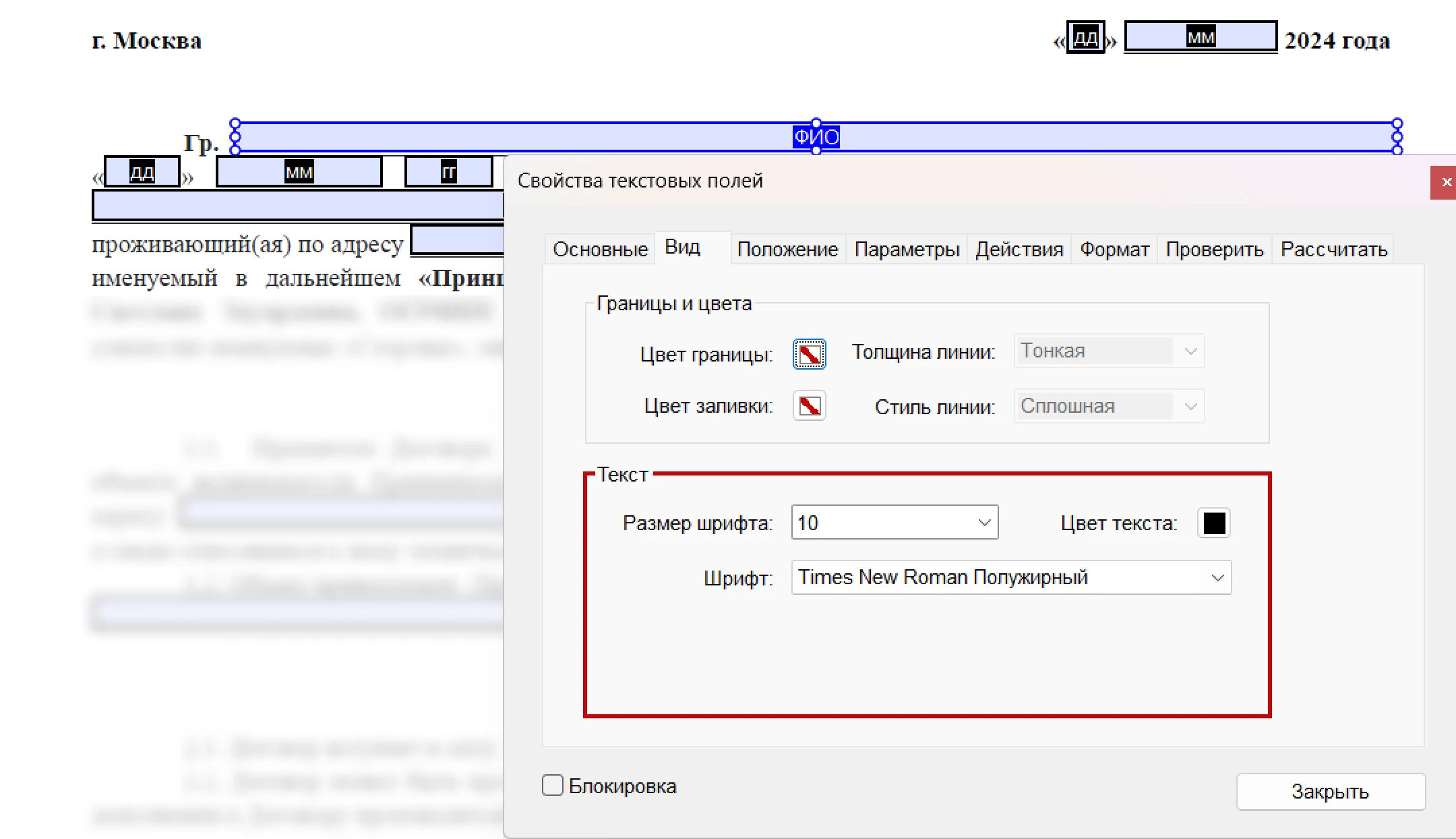 2. Шрифт договора Times New Roman, 10 кегль. Мне нужно, чтобы такой же шрифт был и при заполнении формы клиентом. Поэтому в Свойства текстовых полей > Вид я задала нужный шрифт и нужный размер: