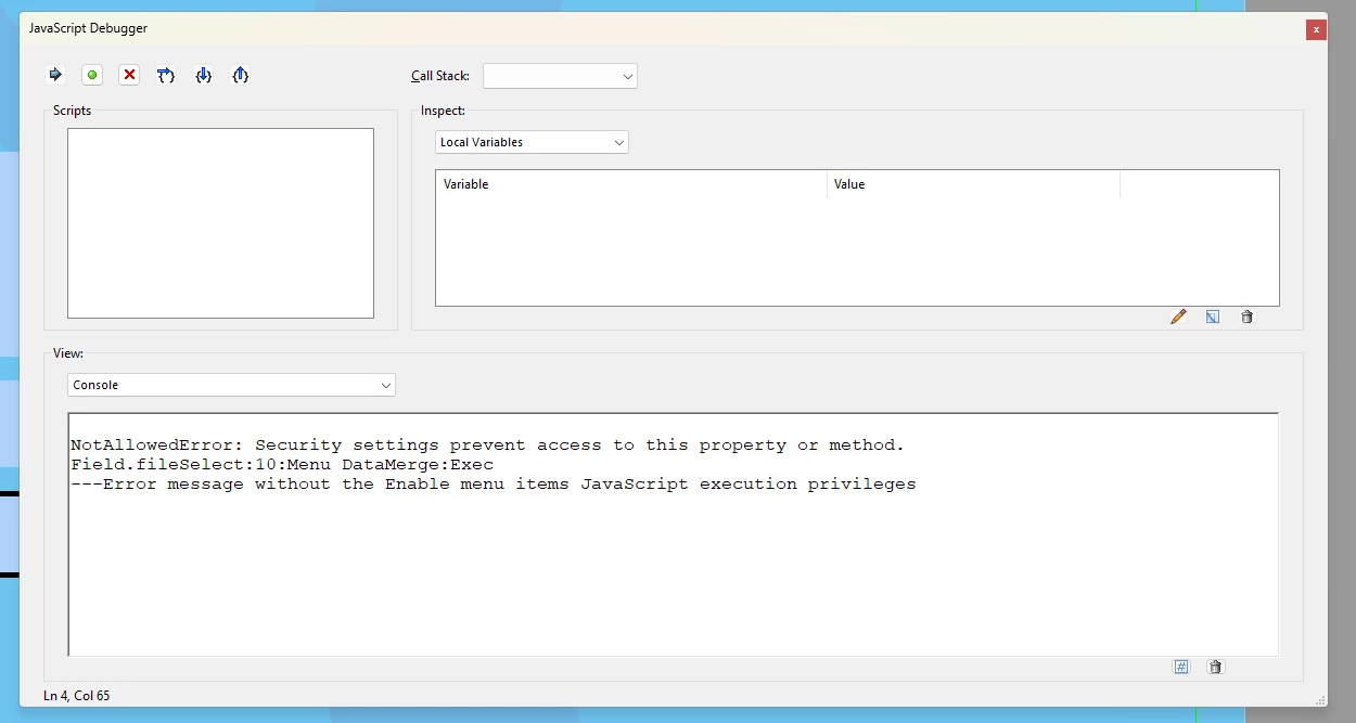 The person has enabled menu items JavaScript execution privileges and in the last conversation, they mentioned that the console error message looks like this: