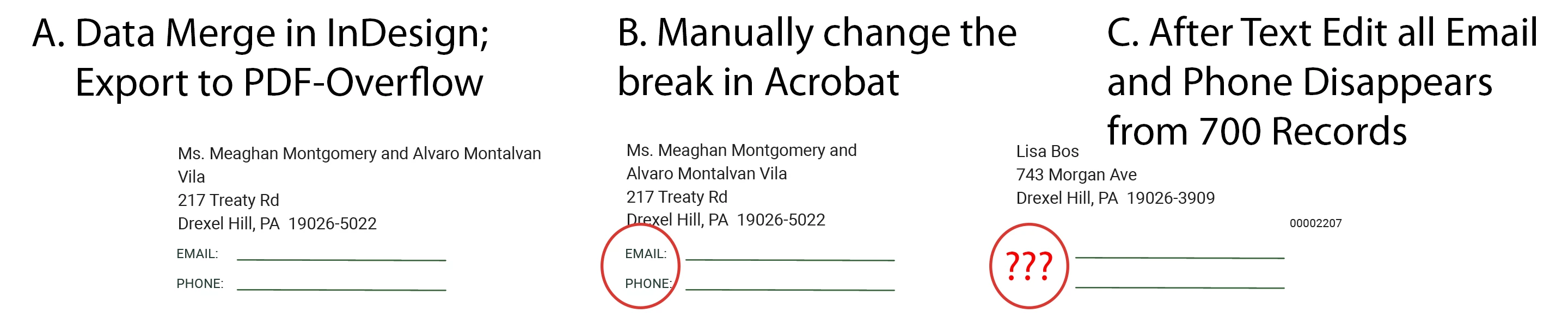 I have a letter mailing which is created in InDesign. I used Data Merge for the variable information. I received a message that there was overflow text on page 435. In Acrobat I manually adjusted the name to 2 lines. Below the text box with the variable text there were 2 lines which said Email with a line and Phone with a line. After manually fixing the name the words Email and Phone disappeared on all 700 letters in the Acrobat file. The lines were still there.
