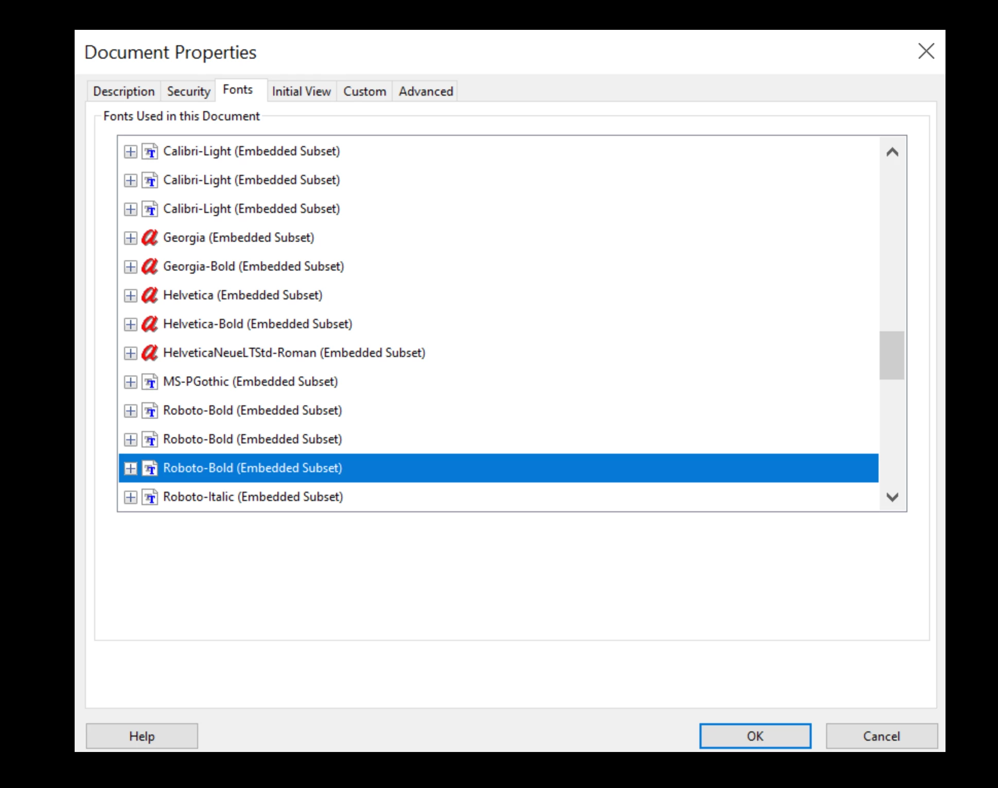 File > Document Properties > Fonts