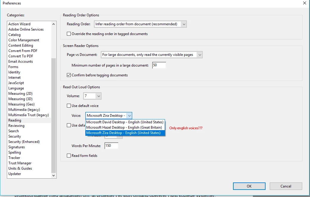 I am trying to get  Acrobat to read out loud in Greek - I have  a Greek pdf with Greek characters - the  language is set to Greek in preferences - advanced - language. I have installed Greek in windows 10 - settings - time  & language . It is not my default viewing language as I will then no longer be able to use my system as I do not read or speak Greek. however, it is listed as the first  language under preferred languages and shows as the default app language, Language pack installed. I have selected Microsoft  Stefanos in text to speech in the speech tab. Still  the pdf reads English [gobblygook] from the Greek  pdf  text. What  must I do to get it to read  the Greek text in Greek?