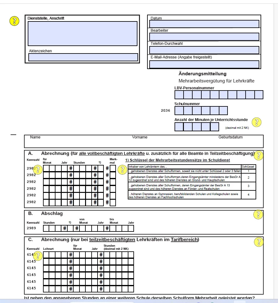 Mein Arbeitgeber will, dass ich eine PDF Datei ausfülle, welche die eingefügten Daten in ein Barcode an der Seite der Datei umwandeln. Nun sind genau diese Felder, welche den Barcode generieren sollen (Abbildung Feld A bis c) nicht beschreibbar. Die Oberen Felder sind beschreibbar und auch hellblau. Ich hab schon in goggle gesucht und nichts gefunden. Arbeitskollegen meinen, bei einigen geht es, bei anderen geht es nicht. Warum weis keiner. Kann mir einer hier erklären woran es liegt.