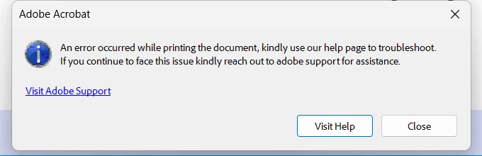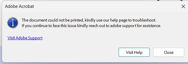 When I try to print, I get this error: "The document could not be printed, kindly use our help page ..." Even when I select Printer - Adobe PDF this error message appears. I can print from Microsoft Office, PDF Studio 2001, browser, Adobe Acrobat Pro ONLINE etc.