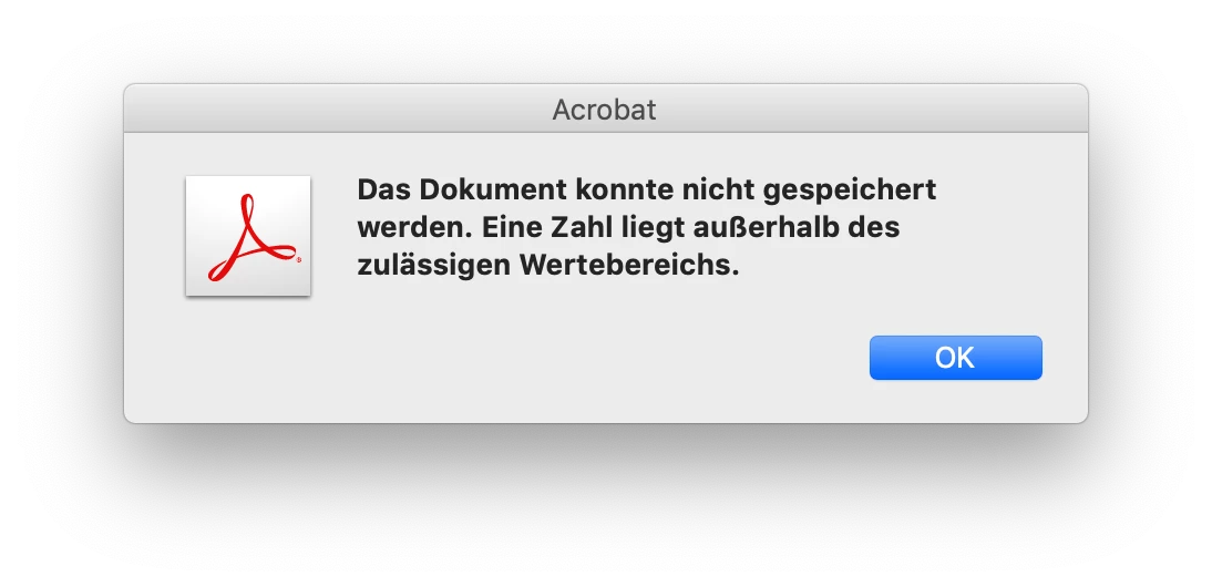 I'm using Adobe Acrobat XI. When I'm trying to save a pdf file I always get the error: "Das Dokument konnte nicht gespeichert werden. Eine Zahl liegt außerhalb des zulässigen Wertebereichs." or translated: "The document could not be saved. A number is out of range." Weeks ago I never had this error.