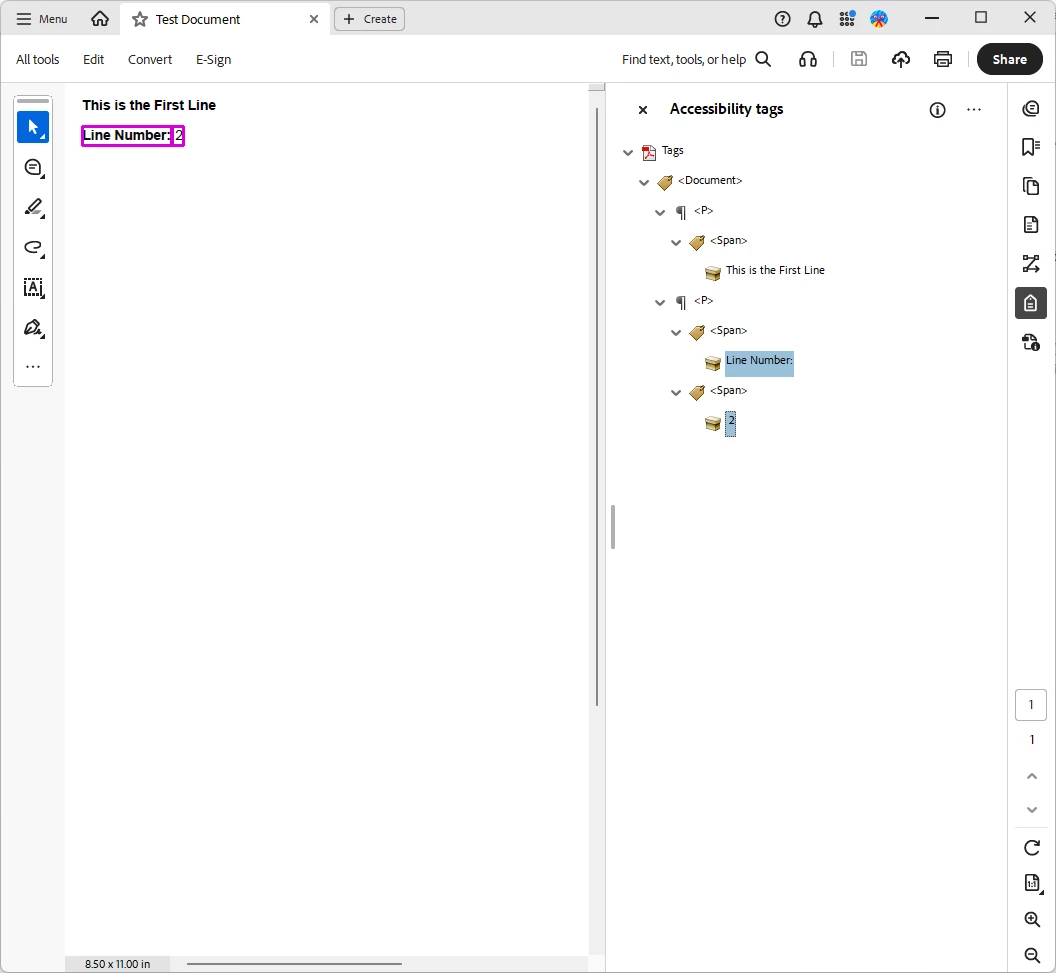 Line Number: 2When Acrobat/Reader is using the “old” layout, the document is read as “This is the first line; Line Number 2”.